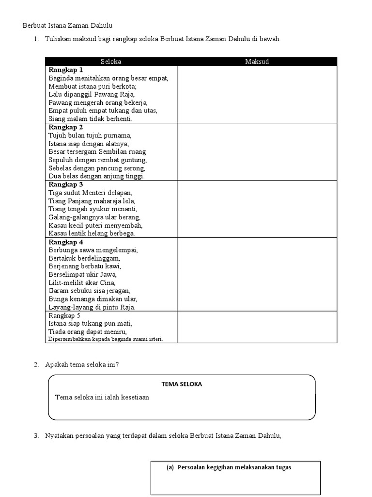 Latihan berbuat istana zaman dahulu - antologi sejadah rindu Latihan Puisi Tradisional Baca seloka di bawah dengan teliti kemudian jawab soalan-soalan yang berikutnya dengan menggunakan ayat anda sendiri. Kita haruslah bertanggungjawab terhadap tugas yang diberi Raja menitahkan orang besar empat untuk membina istana berkota. Pawang mengerah orang bekerja Empat puluh empat tukang dan utas Siang malam tidak berhenti.